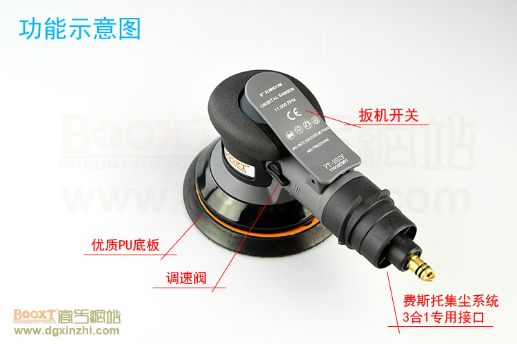 • 產(chǎn)品參數(shù): 底盤(pán)尺寸:5寸(125mm);轉(zhuǎn)速:11000rpm;偏擺:2.5mm;重量:0.8kg;使用氣壓:0.65Mpa;推薦氣管:內(nèi)徑8mm;耗氣量:0.53立方米/分鐘,需搭配集塵桶使用,機(jī)器使用時(shí)多加氣動(dòng)油保養(yǎng)。
