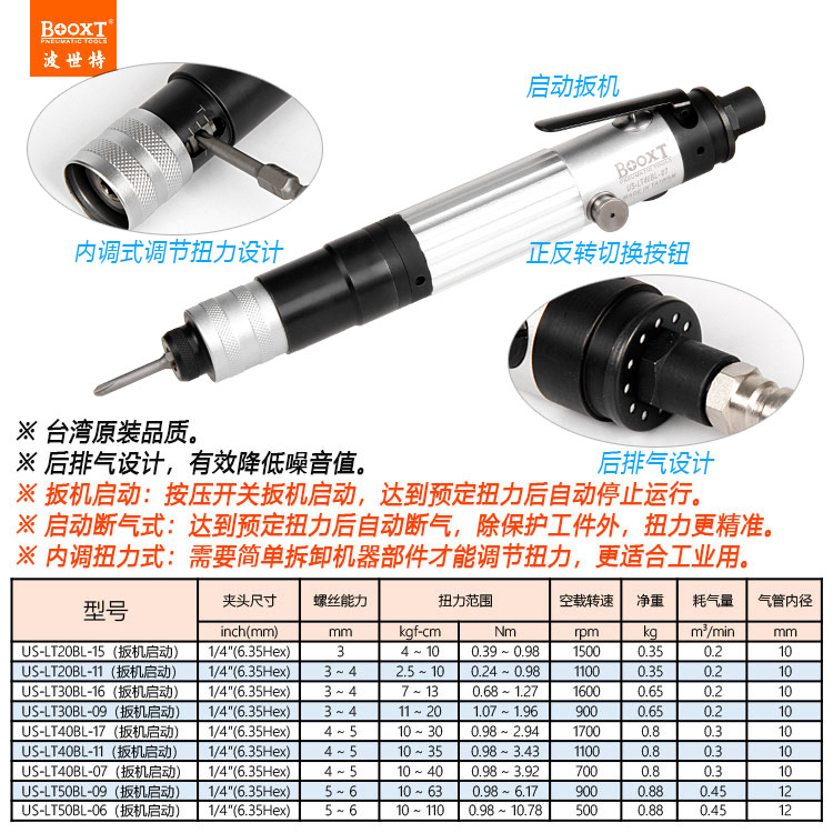 東莞強(qiáng)勁五金工具有限公司提供臺(tái)灣BOOXT波世特氣動(dòng)工具,可調(diào)扭力風(fēng)批US-LT40BL-17系列廠家直銷,首件享特價(jià)。咨詢熱線:4008301980