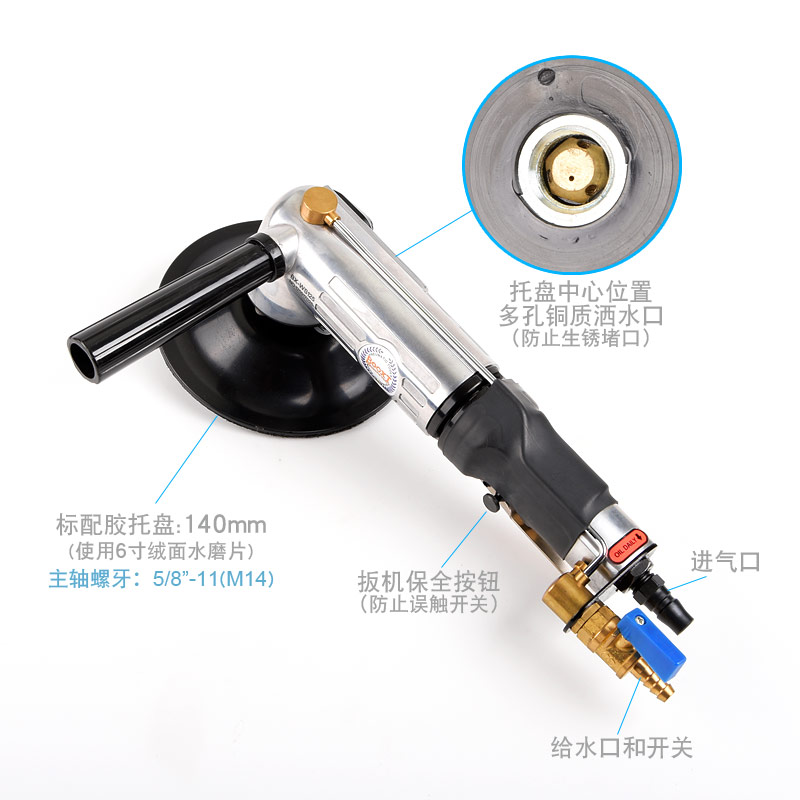 • 產(chǎn)品參數(shù): 托盤尺寸:140mm(M14螺牙);使用磨片:140mm或150mm;轉(zhuǎn)速:11000rpm;長度:300mm;重量:2.0kg;功率:0.61hp;耗氣量:0.46立方米/分鐘;使用工作氣壓:0.63Mpa;推薦氣管內(nèi)徑8mm;平時使用應(yīng)多加氣動油保養(yǎng)