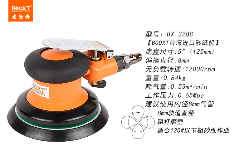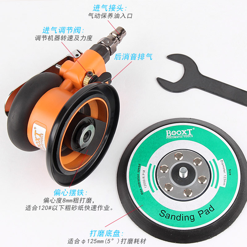 • 產(chǎn)品參數(shù): 底盤尺寸:5寸(125mm);空載轉(zhuǎn)速:12000rpm;偏擺直徑:8mm;重量:0.84kg;耗氣量:0.53m3/min;工作使用氣壓0.65Mpa,推薦使用8mm內(nèi)徑氣管,使用時(shí)多加氣動(dòng)油保養(yǎng)。