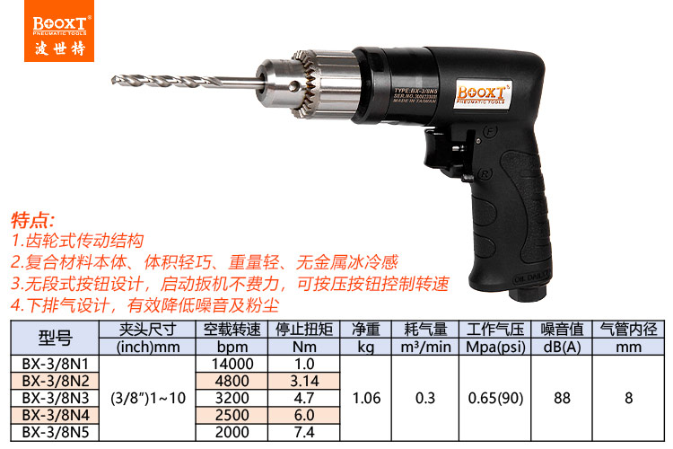 東莞市強(qiáng)勁五金工具有限公司提供臺(tái)灣BOOXT波世特品牌氣動(dòng)工具,臺(tái)灣氣鉆BX-3/8N3廠家直銷,首件享特價(jià)。咨詢熱線:4008301980