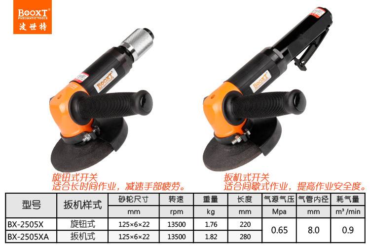 東莞市強(qiáng)勁五金工具有限公司提供臺灣BOOXT波世特品牌氣動工具,角向氣動砂輪機(jī)BX-2505XA廠家直銷,首件享特價。咨詢熱線:4008301980