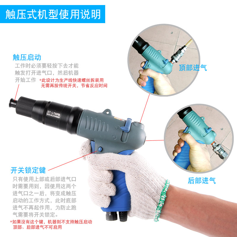 A.觸壓式(全自動(dòng)):靠風(fēng)批頭頂螺絲頭啟動(dòng),到達(dá)預(yù)設(shè)扭力自動(dòng)停止。(效率高)