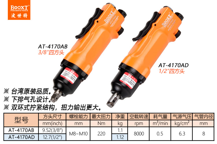 東莞市強(qiáng)勁五金工具有限公司提供臺(tái)灣BOOXT波世特品牌氣動(dòng)工具,直柄氣動(dòng)扳手AT-4170AB廠家直銷,首件享特價(jià)。咨詢熱線:4008301980