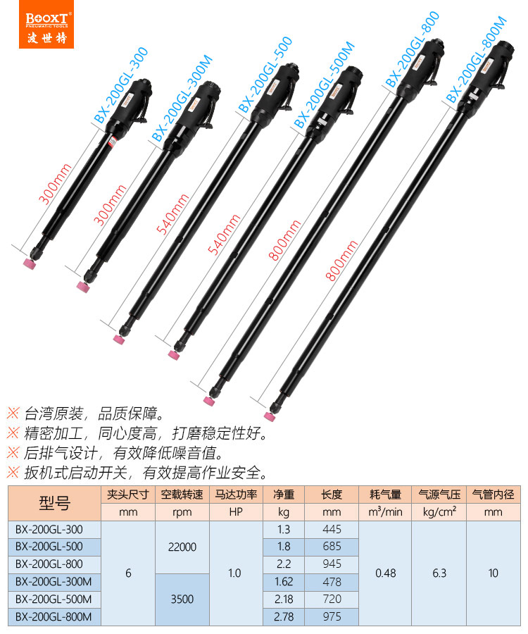 東莞市強(qiáng)勁五金工具有限公司提供臺(tái)灣BOOXT波世特品牌氣動(dòng)工具,氣動(dòng)直磨機(jī)BX-200GL-800M廠家直銷(xiāo),首件享特價(jià)。咨詢(xún)熱線(xiàn):4008301980