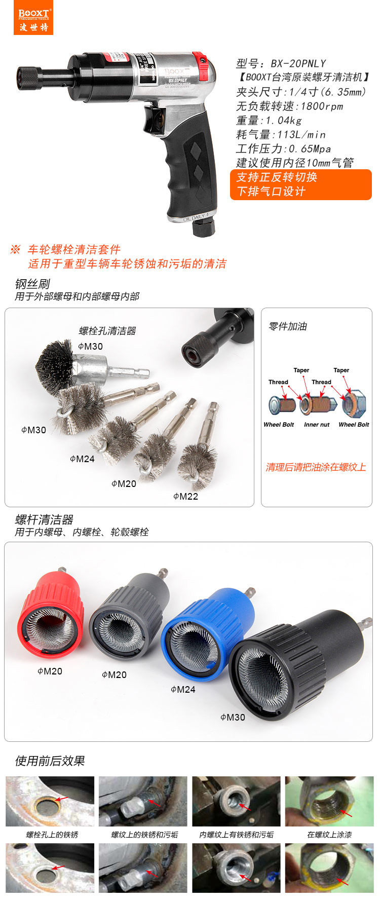 • 產(chǎn)品用途: 適用于車輛車輪螺栓螺牙的鐵銹、污垢清理作業(yè)。