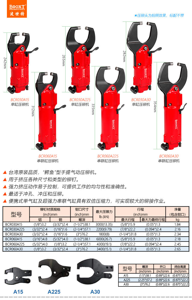 東莞市強(qiáng)勁五金工具有限公司提供臺(tái)灣BOOXT波世特品牌氣動(dòng)工具,鱷魚(yú)口氣動(dòng)壓鉚機(jī)BCR030A15廠(chǎng)家直銷(xiāo),首件享特價(jià)。咨詢(xún)熱線(xiàn):4008301980