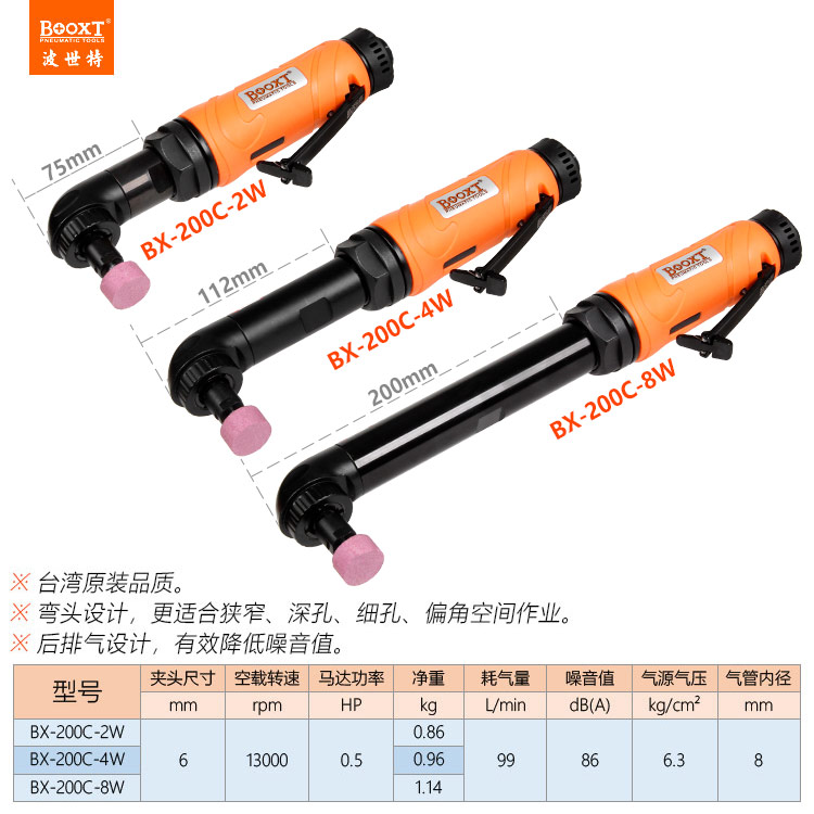 東莞市強勁五金工具有限公司提供臺灣BOOXT波世特品牌氣動工具,直角氣動打磨機BX-200C-4W廠家直銷,首件享特價。咨詢熱線:4008301980