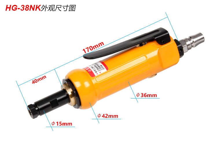 • 產(chǎn)品參數(shù): 夾頭能力:M6 【可選配M3夾頭】 空載轉(zhuǎn)速:22000rpm 細桿直徑:15mm 細桿長度:40mm 全 長:170mm 重 量 : 0.54kg 耗 氣 量:0.45m3/min 【細桿/專業(yè)型】