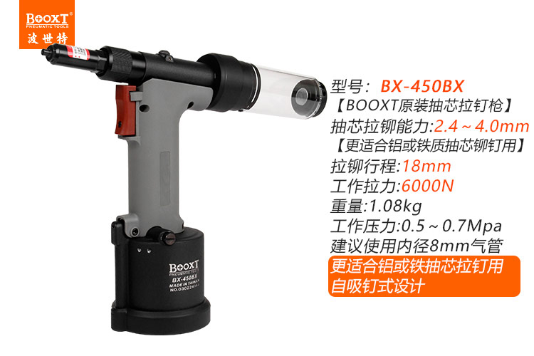東莞市強(qiáng)勁五金工具有限公司提供臺灣BOOXT波世特品牌氣動工具,自吸氣動鉚釘槍BX-450BX廠家直銷,首件享特價(jià)。咨詢熱線:4008301980
