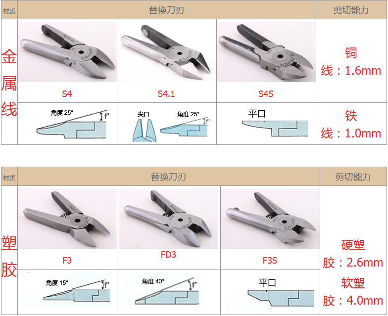 2.注意材質(zhì):材質(zhì)對選配刀刃非常重要,例如客戶要剪的銅鐵、材質(zhì)有鍍鈦、鍍烙、塑料材質(zhì)、加纖維超過20% 時,一般刀刃不是剪不斷,就是使用壽命大大減少,塑料還容易在剪斷過程中碎裂。在這情形S刀刃應選擇Z刀,塑料則建議使用電熱剪。